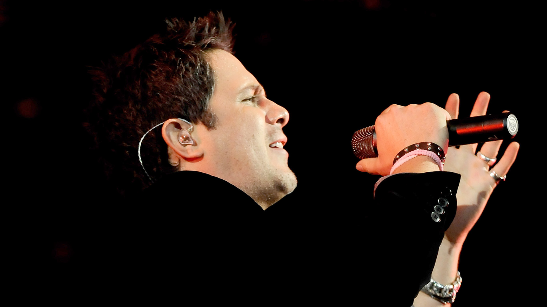 Description: A man with a microphone in his hand and a ring on his finger.