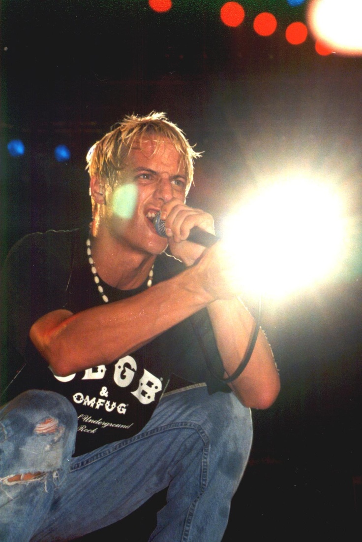 Description: A man with a microphone in his hand on stage with lights behind him and a person sitting on the ground.