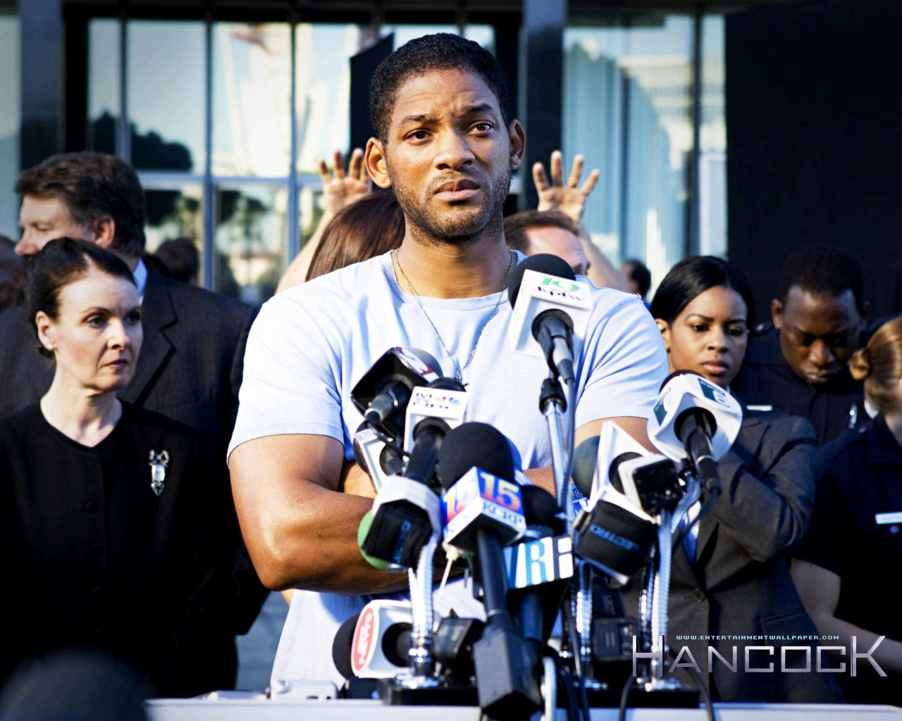 Description: A man standing in front of a bunch of microphones in front of a crowd of people with their hands up.