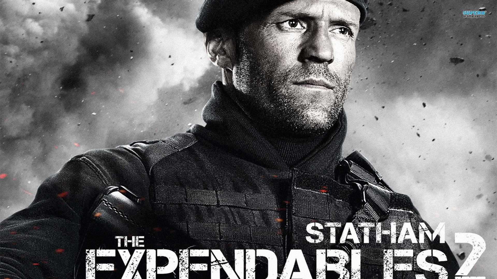 Description: A man in a black uniform holding a gun in front of a black and white background with the words the expendales 2.