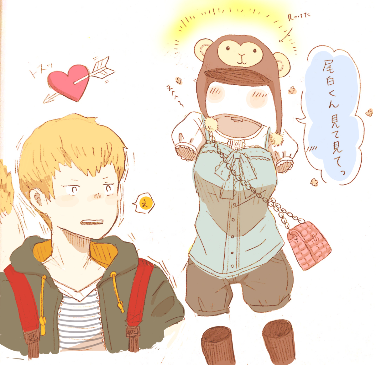 Description: A drawing of a man and a monkey with a heart on his chest and a woman with a backpack.