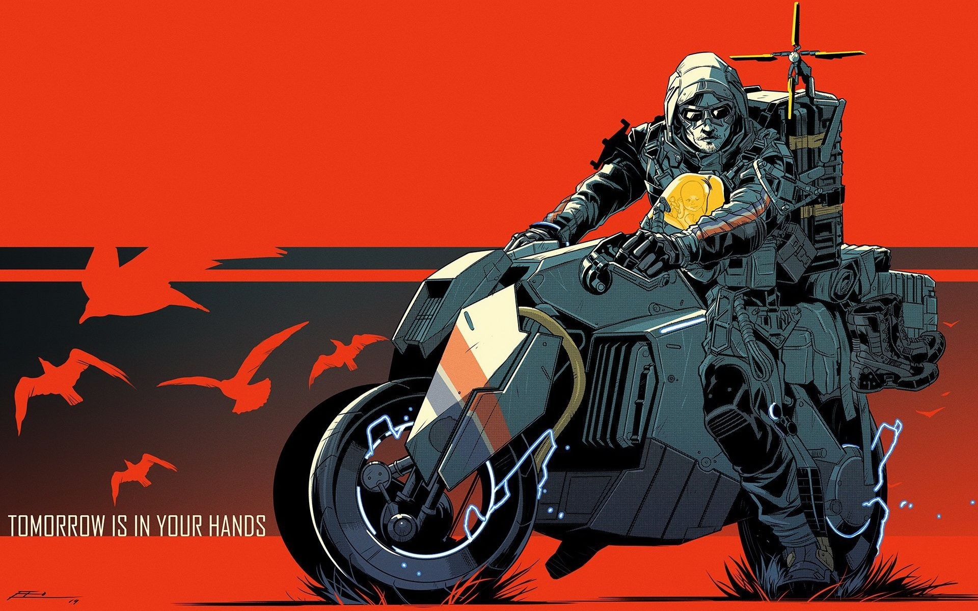 Description: A man riding a motorcycle on a red background with birds flying around him and a red sky behind him.