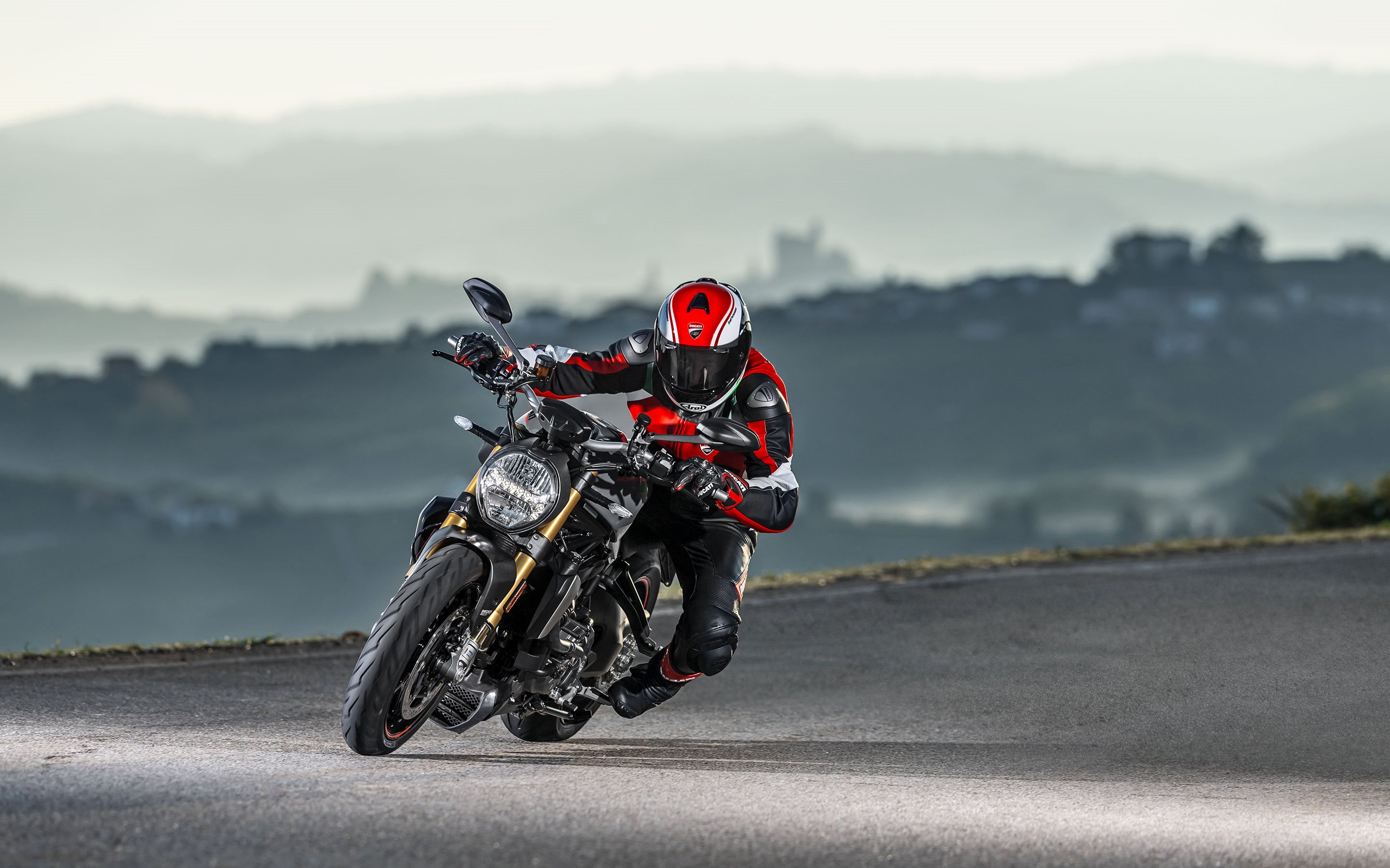 Description: A man riding a motorcycle down a road next to a lush green hillside covered in trees and bushes on a cloudy day.