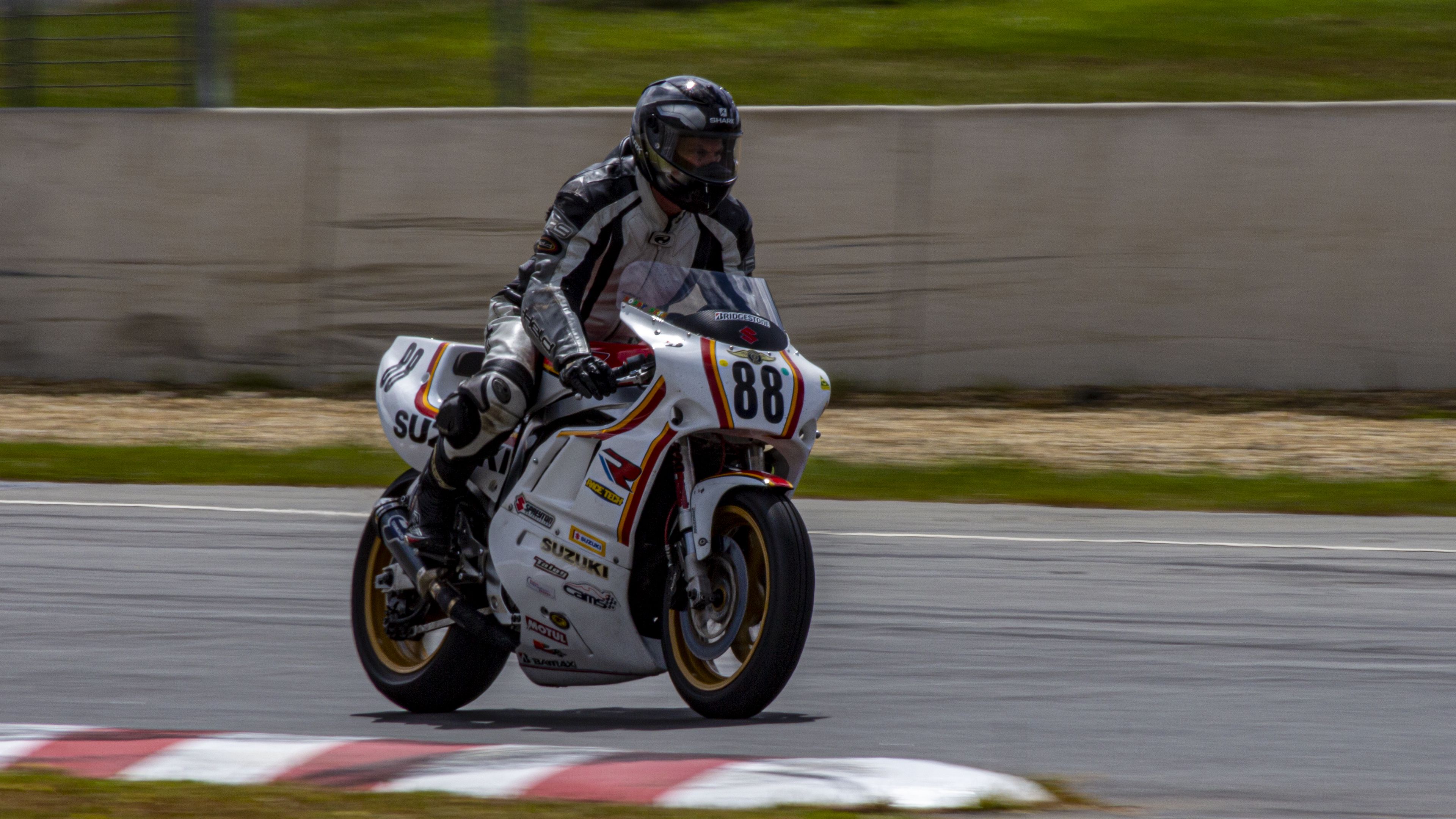 Description: A man riding a motorcycle on a race track with a helmet on and a helmet on his head and a helmet on.