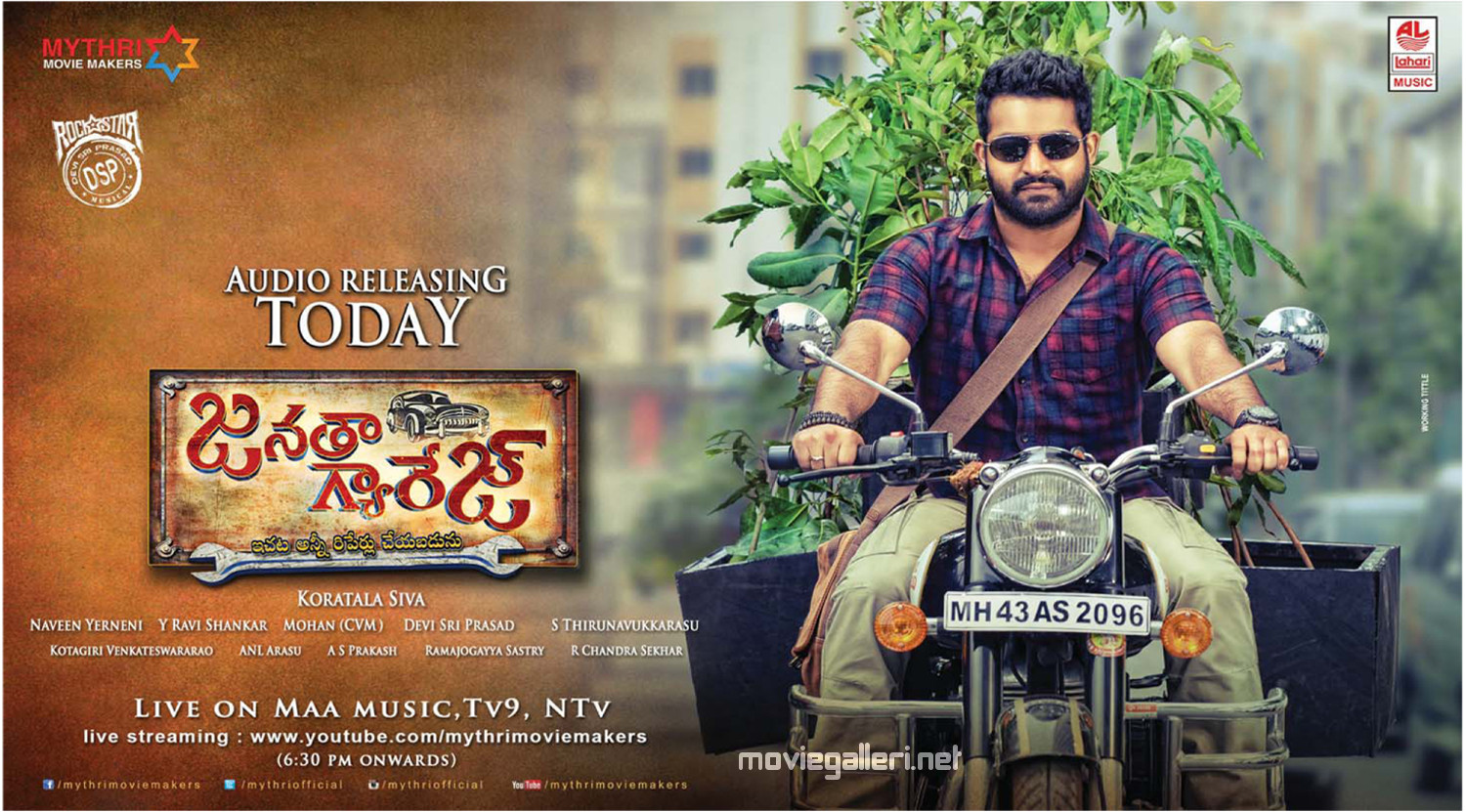 Description: A man riding a motorcycle with a sign on the back of it that says live on maa music.