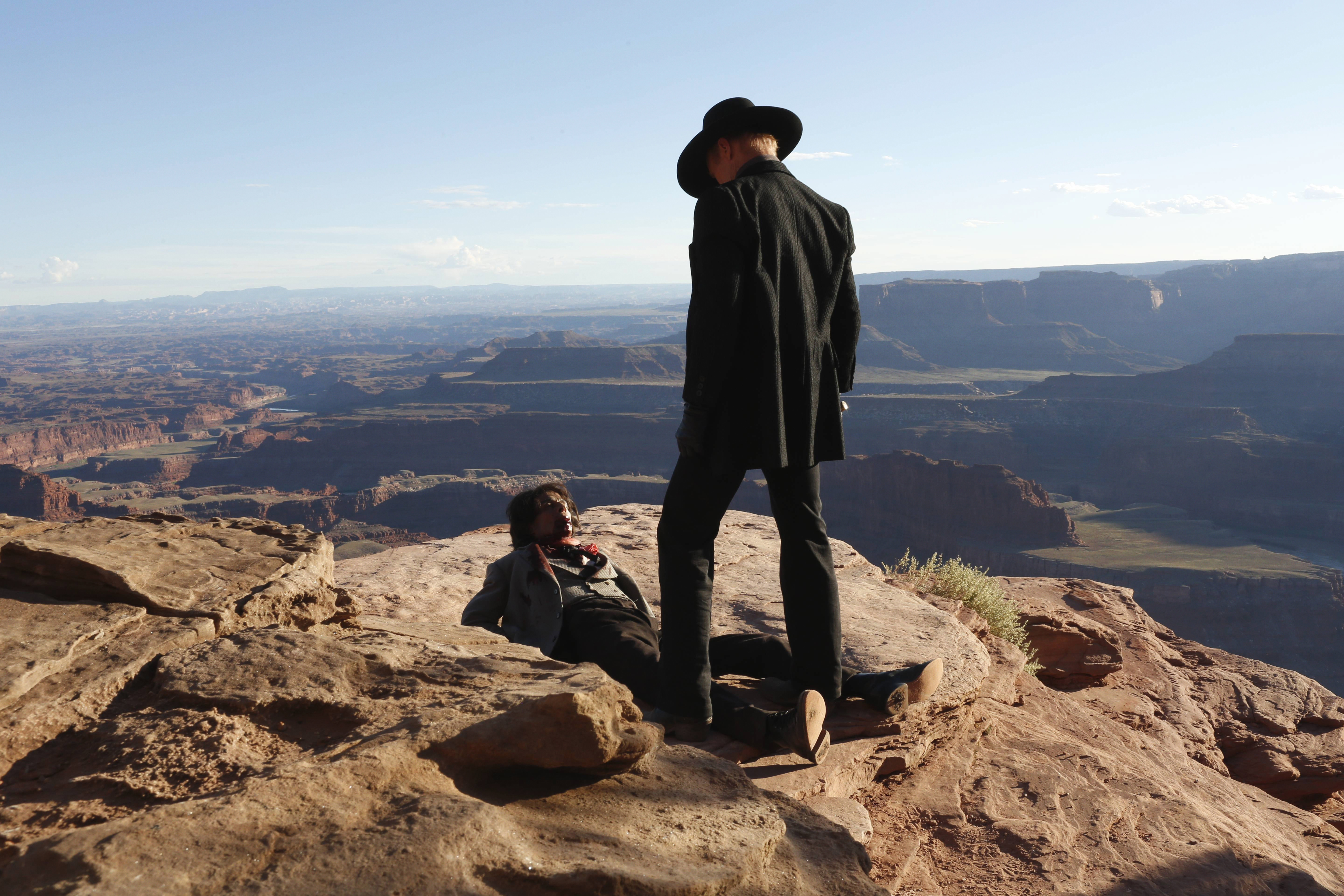 Description: A man standing on top of a mountain next to a man in a suit and hat on a rock.