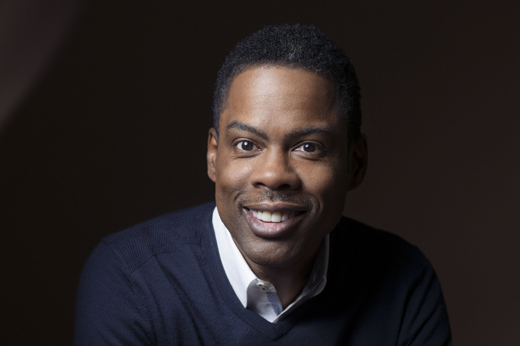 Description: A man with a mustache and a sweater on smiling for a picture in a dark room with a black background.
