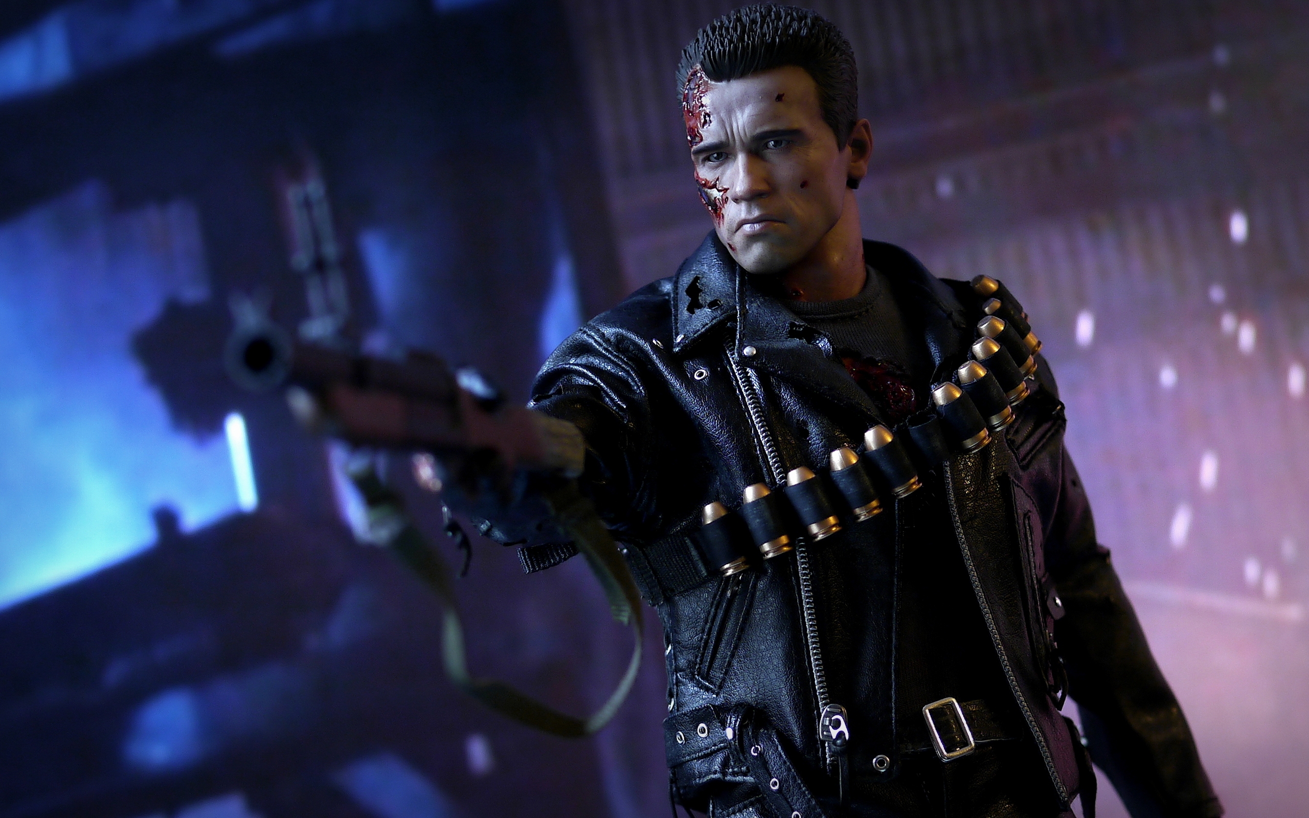 Description: A man holding a gun in a dark room with a neon background behind him and a blue light behind him.