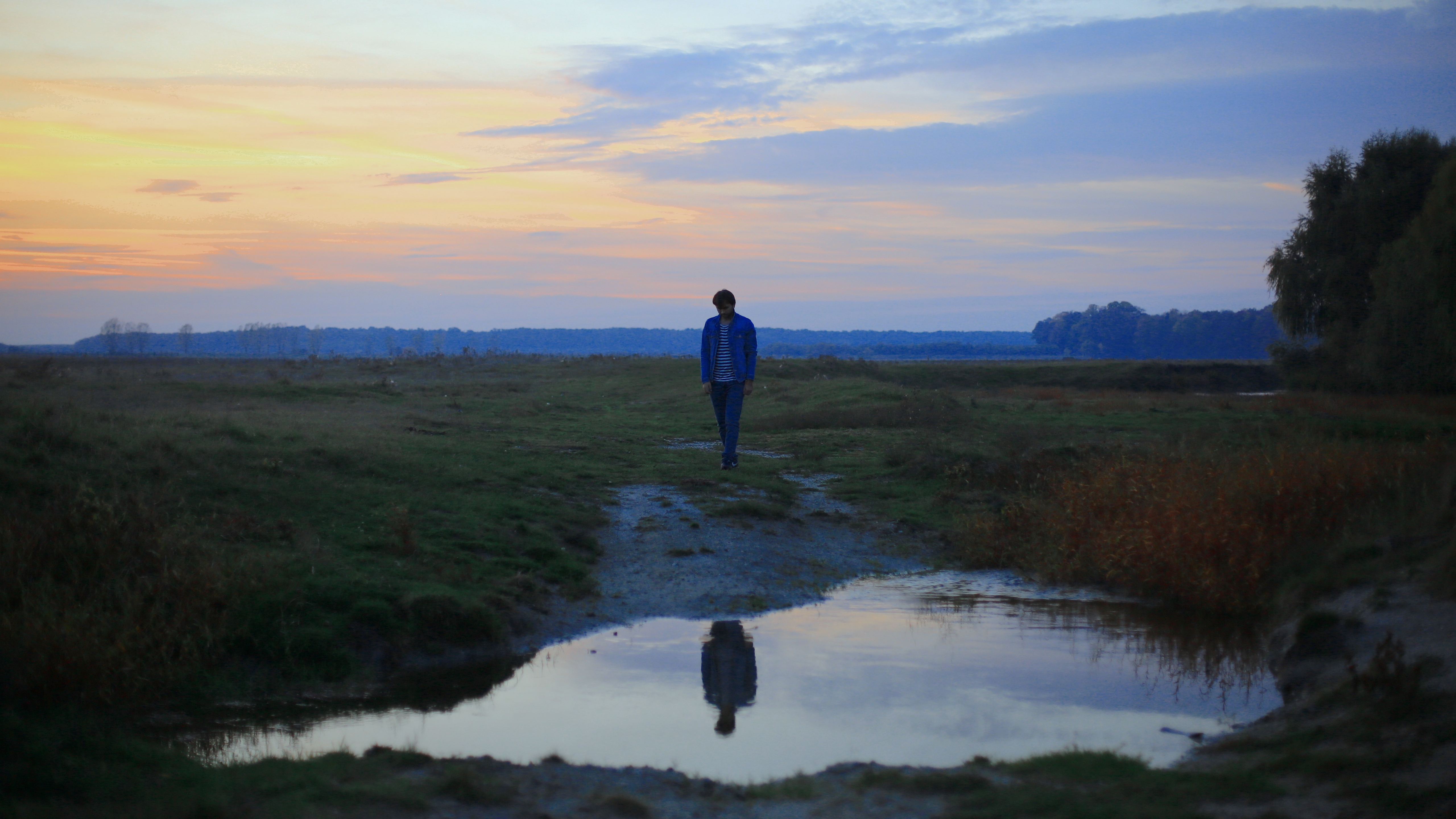 Description: A man standing on a path near a puddle of water at sunset or dawn with a reflection of him in the water.