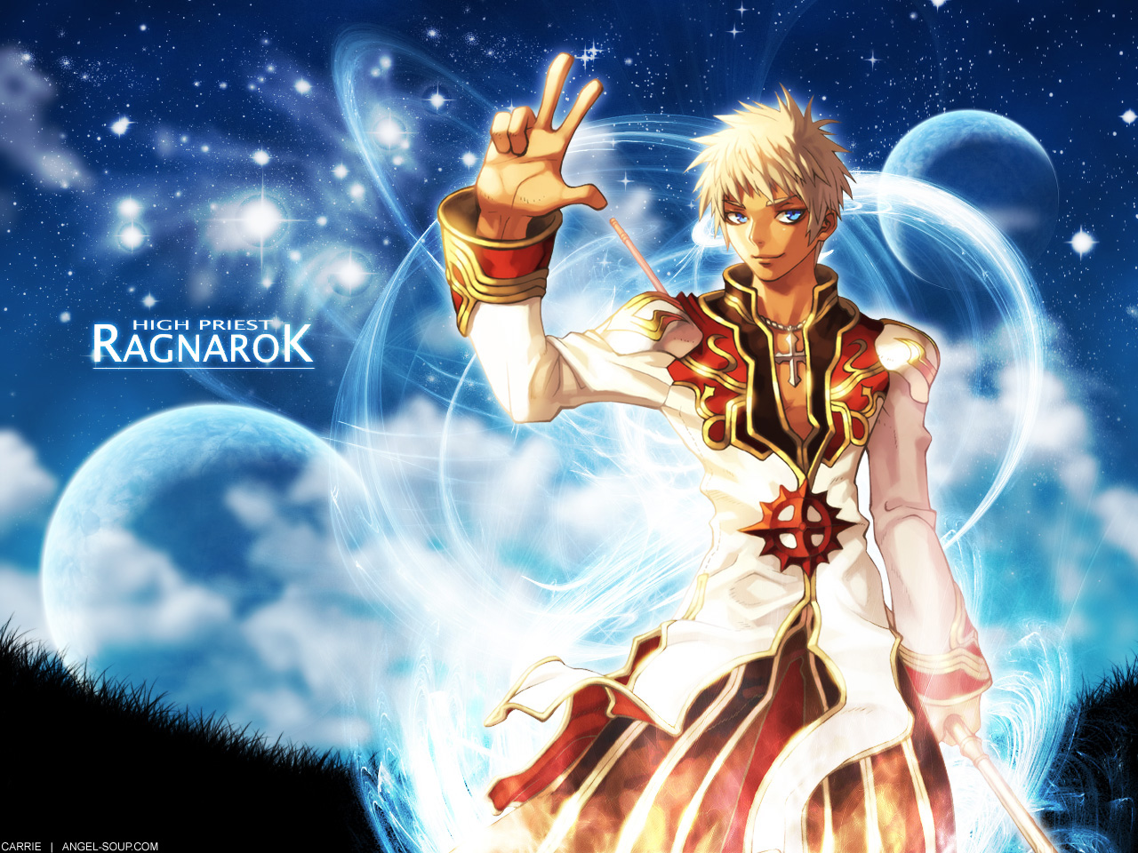 Description: A man in a white and red outfit holding a peace sign in his hand and a sky background with stars.