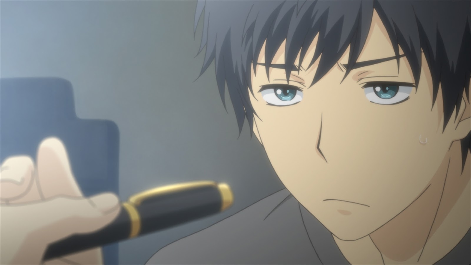 Description: A man holding a pen in his hand and looking at the camera with a serious look on his face.
