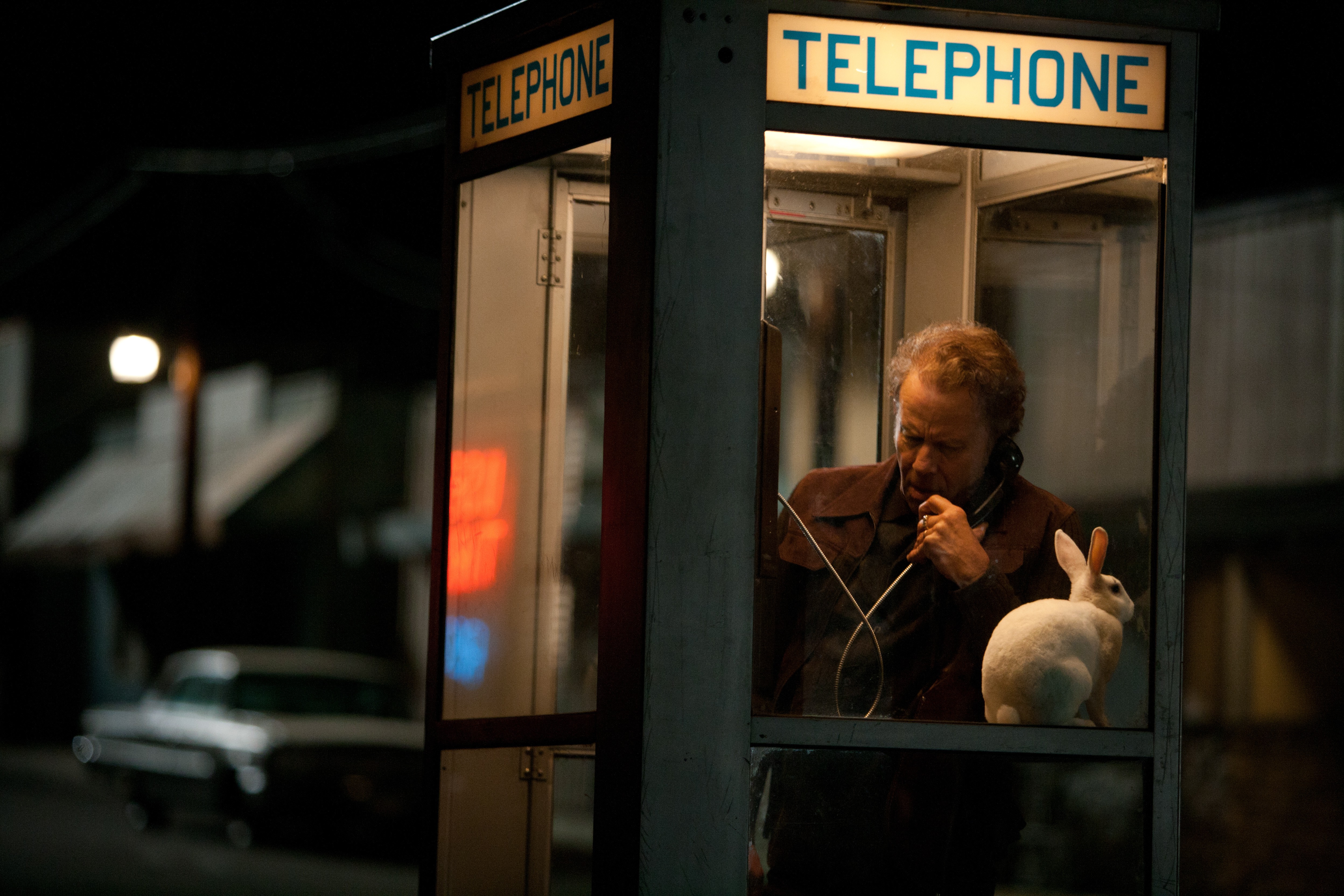 Description: A man is on a phone booth with a rabbit in it's lap and a car in the background.