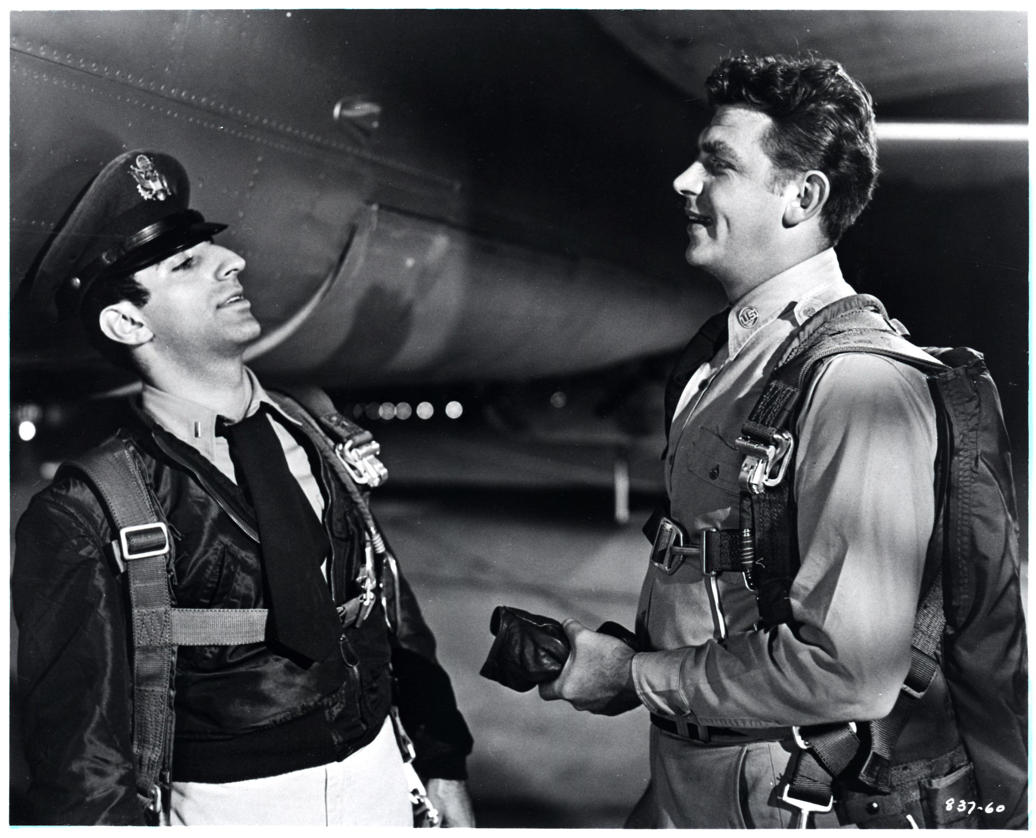 Description: A man in a pilot's uniform talking to another man in a pilot's uniform in front of a plane.