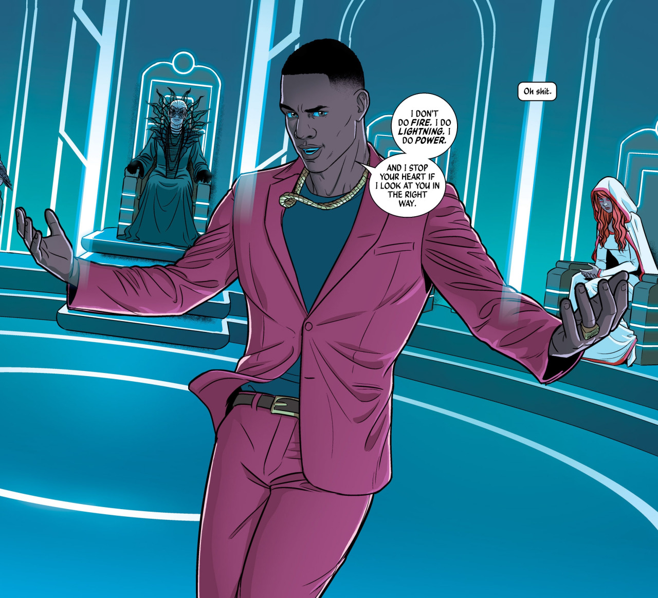 Description: A man in a pink suit holding a pair of shoes in his hand and a comic bubble above his head.