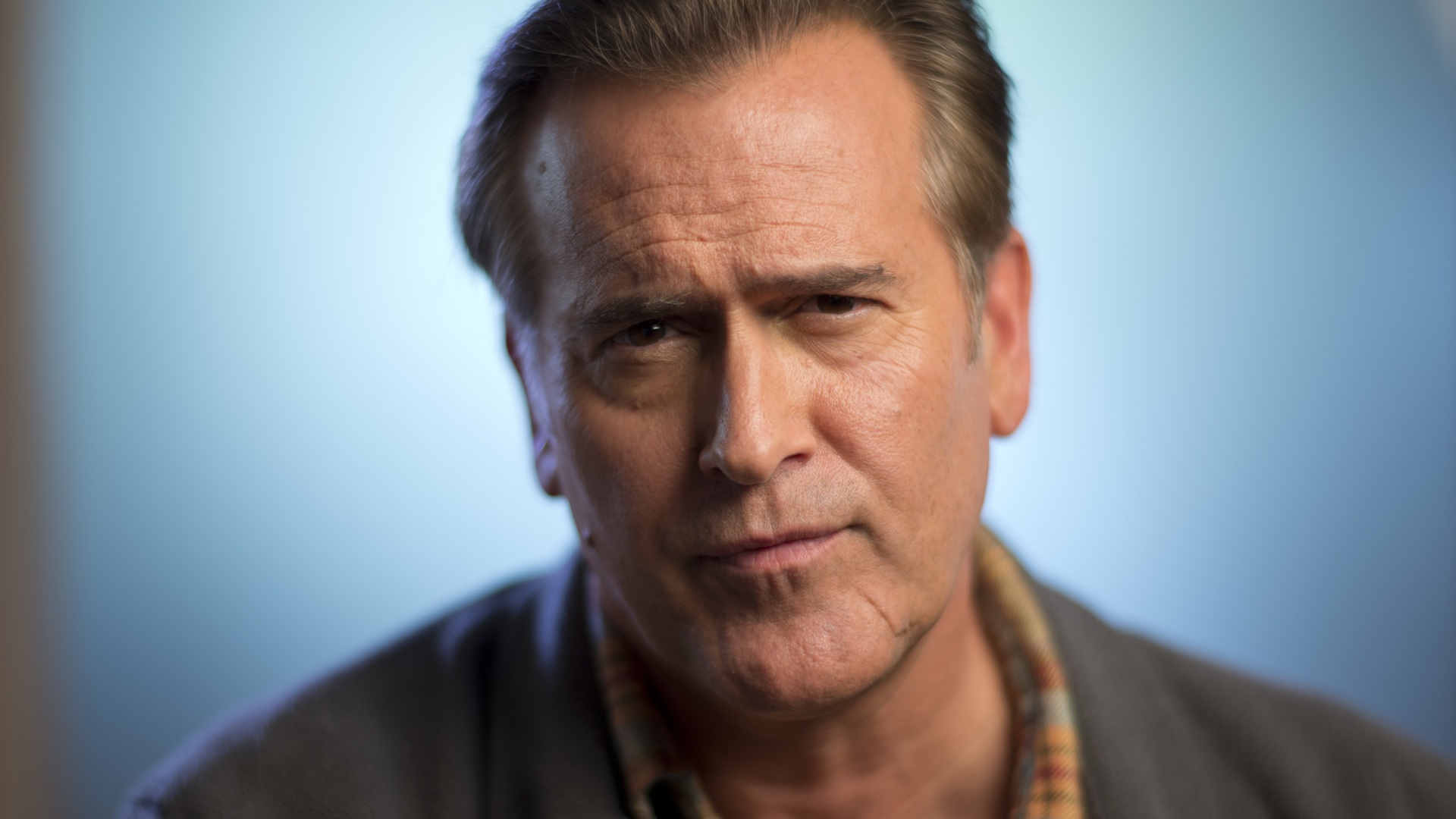 Description: A man with a plaid shirt and a necklace on his neck looking at the camera with a serious look on his face.