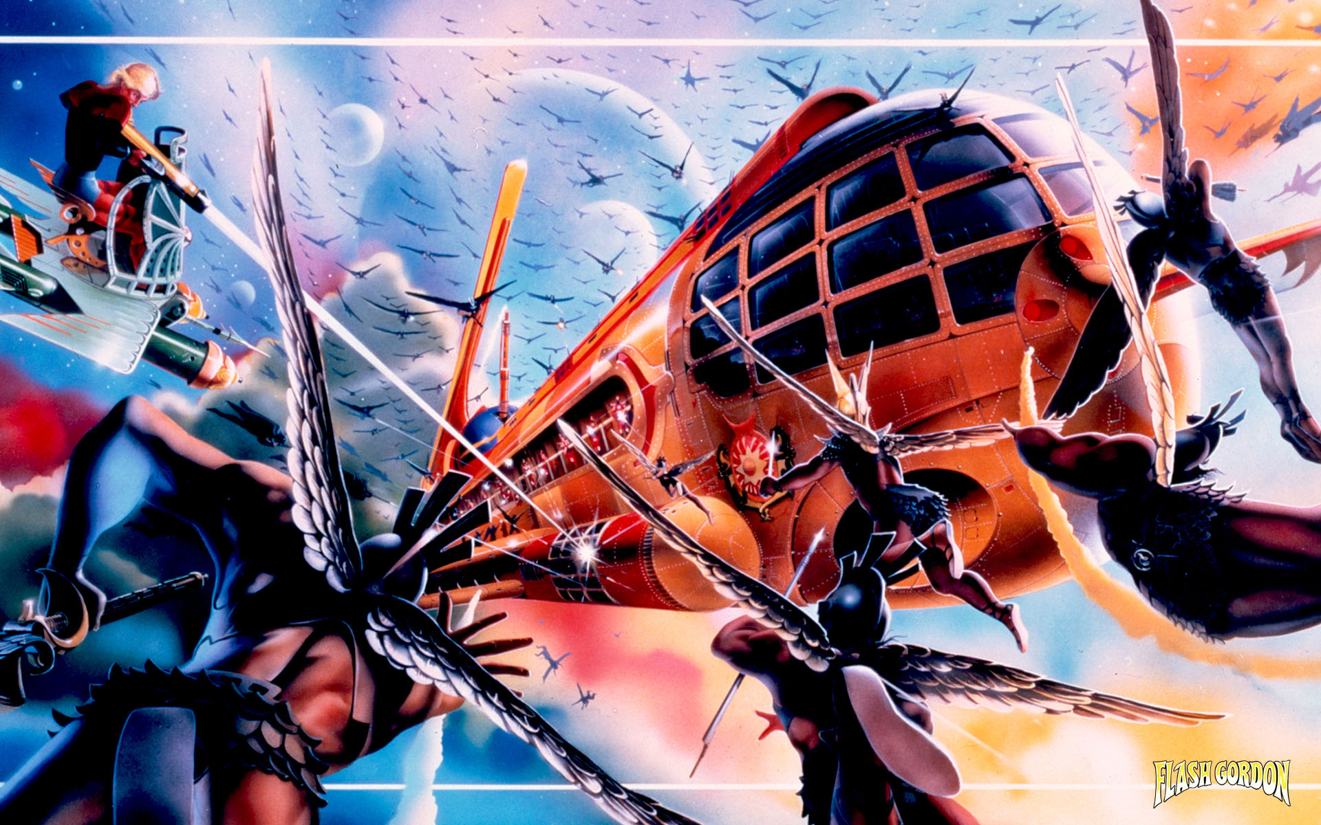 Description: A painting of a man on a plane with other people around him and a plane in the background with a sky full of clouds.