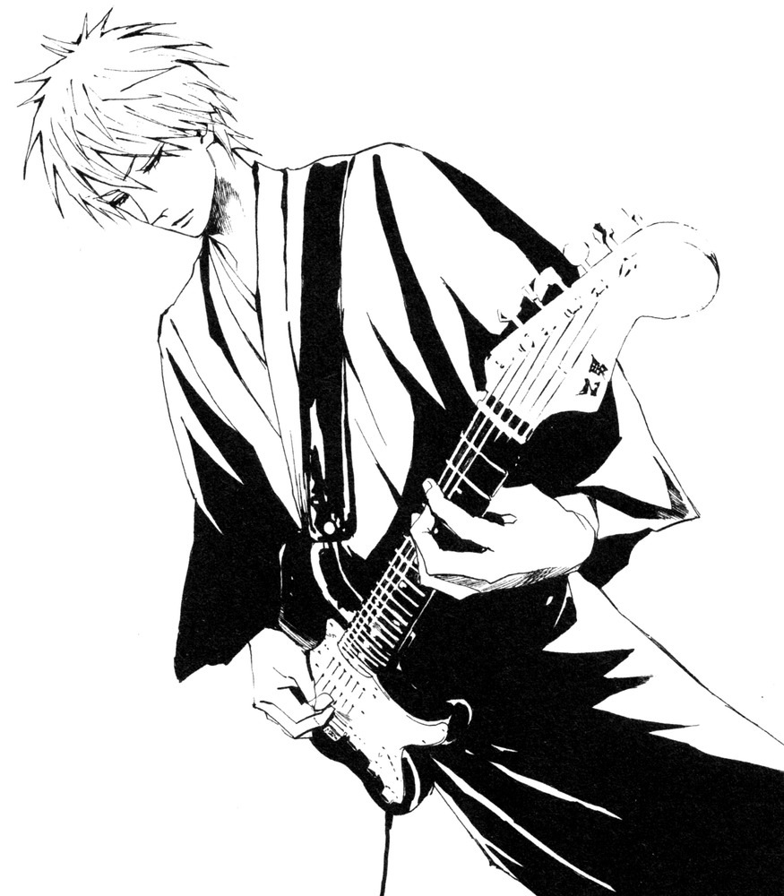 Description: A drawing of a man playing a guitar with a black and white background and a black and white background.