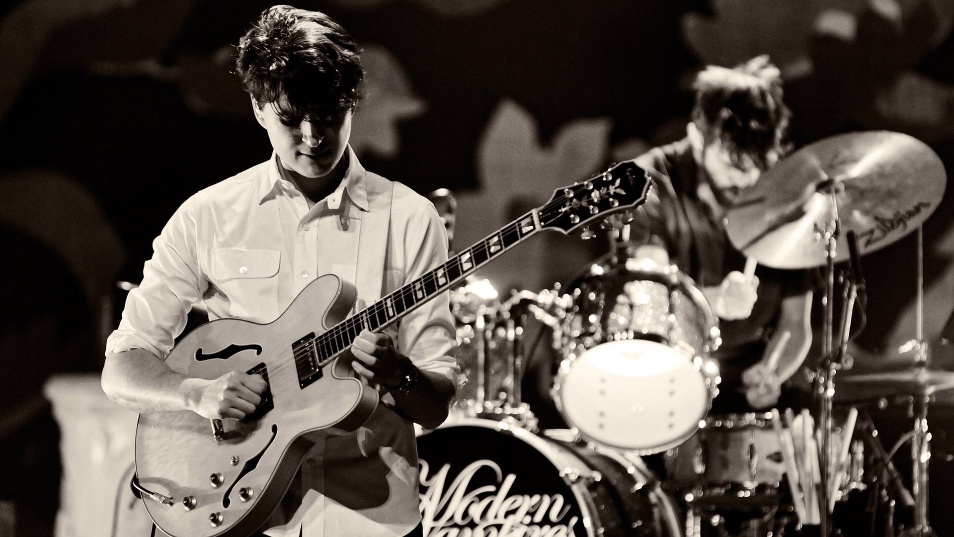 Description: A man playing a guitar on stage with another man behind him playing drums and drumsticks behind him.