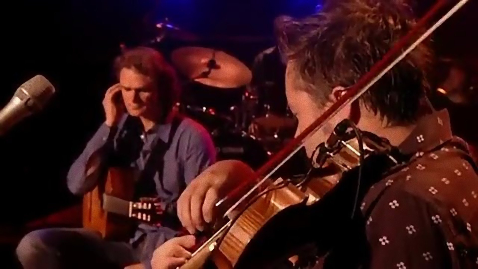 Description: A man playing a guitar while another man sings into a microphone behind him on stage with a microphone in his hand.