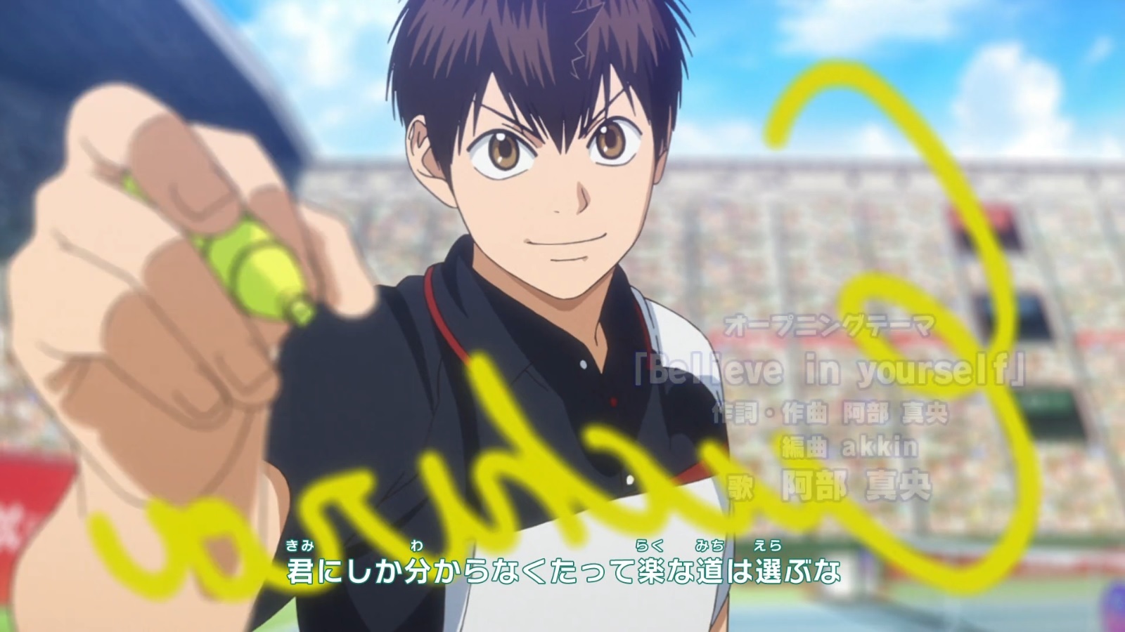 Description: A man pointing at a tennis ball with a tennis racket in his hand and a tennis ball in his other hand.