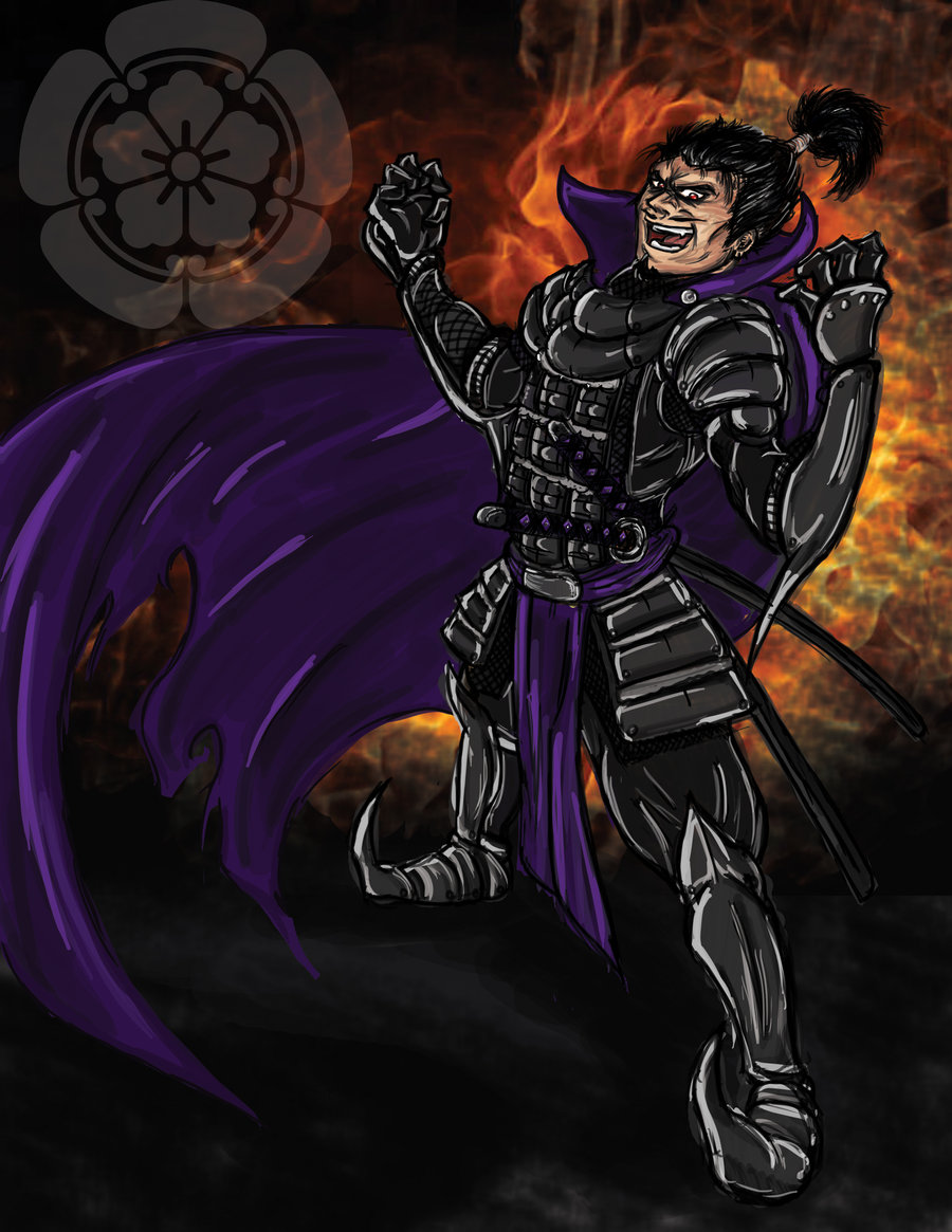 Description: A drawing of a man in a purple outfit with a sword and a purple cape on his head and a black background.