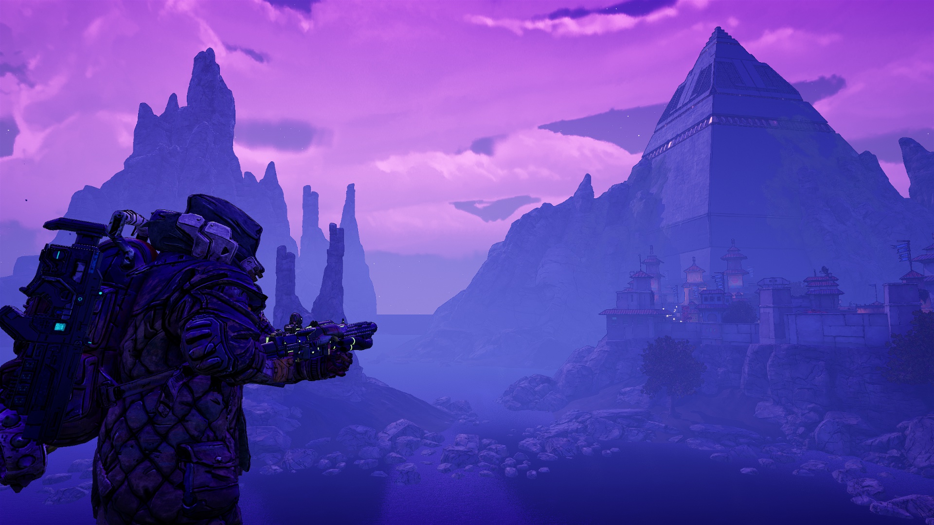 Description: A man holding a gun in front of a purple sky with mountains in the background and a castle in the distance.