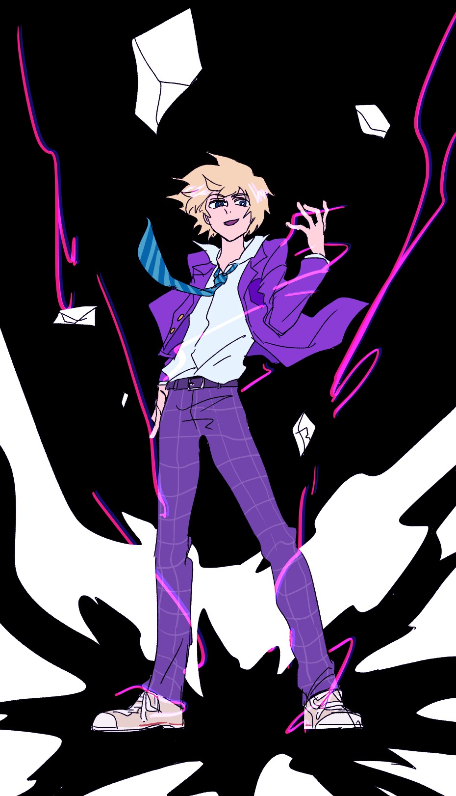 Description: A drawing of a man in a purple suit and tie with a kite in the background of a black and white background.