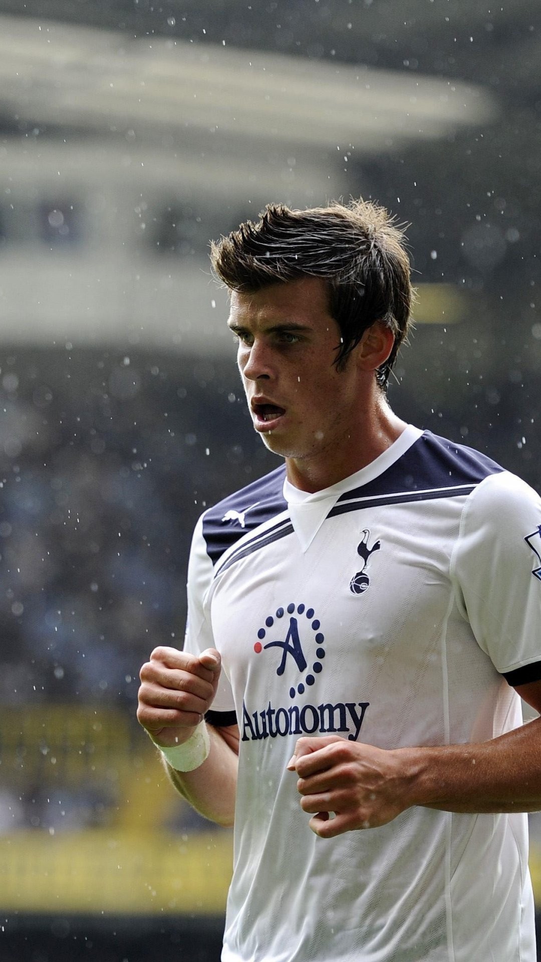 Description: A man in a white shirt is running in the rain with a soccer ball in his hand and a blue and white shirt on.