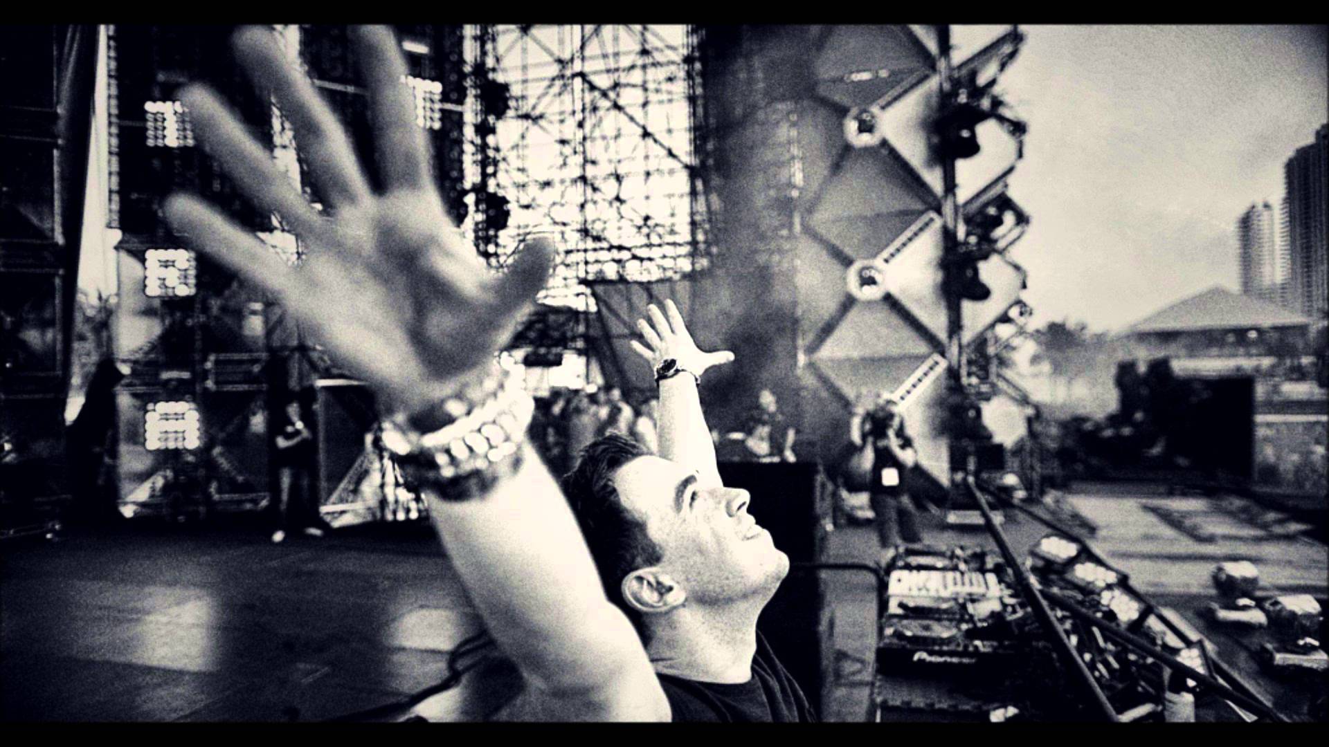 Description: A man reaching up to grab something off of a shelf in a store with his hands up in the air.