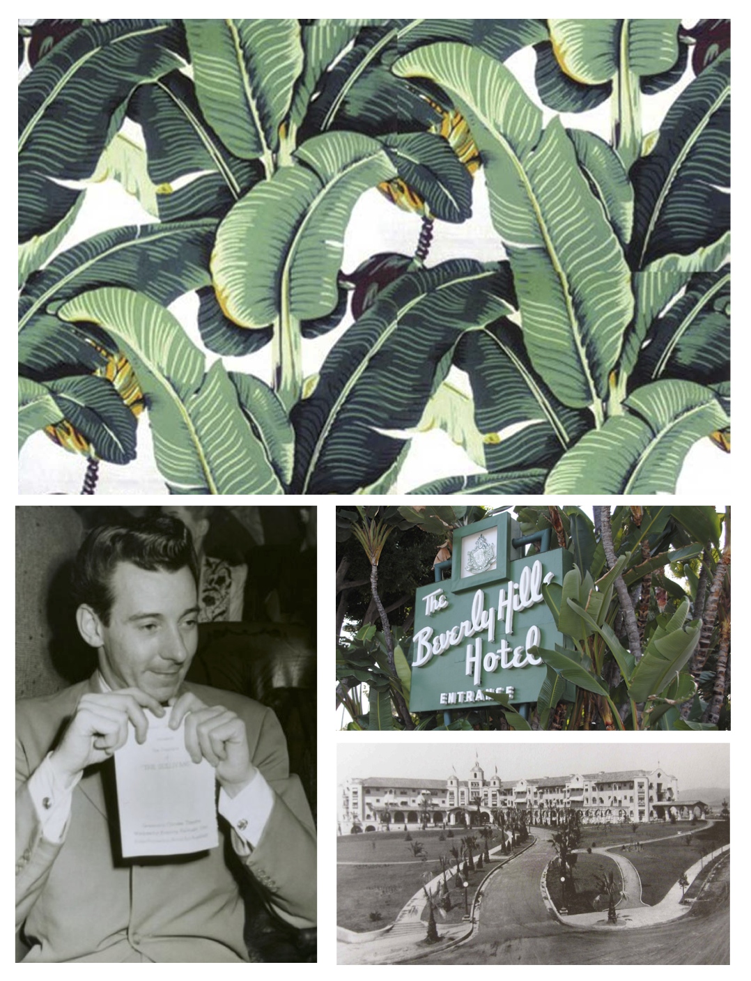 Description: A man is reading a book in front of a bunch of green leaves and a sign that says bushland hotel.