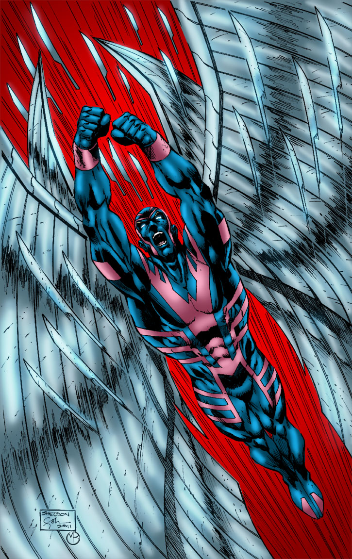 Description: A man in a red and black suit with wings on his back and a red and black mask on his face.