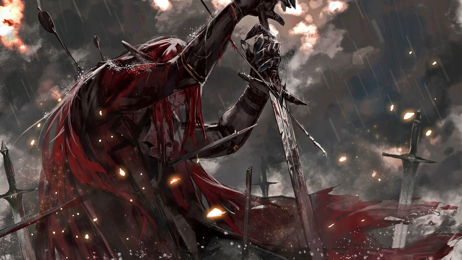 Description: A man in a red cape holding a sword and a sword in his hand in the rain with a sky full of clouds.
