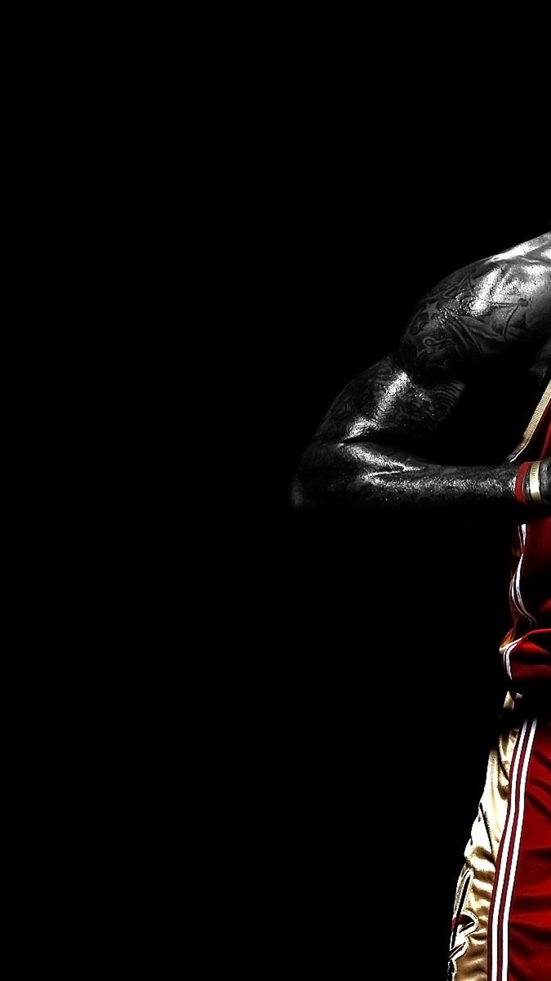 Description: A man in a red and gold uniform holding a basketball ball in his hand and a black background behind him.