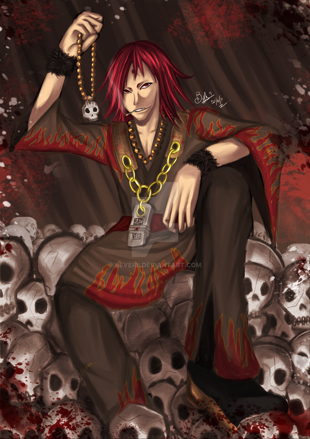 Description: A man with red hair sitting on a pile of skulls with a gun in his hand and a skull in his other hand.