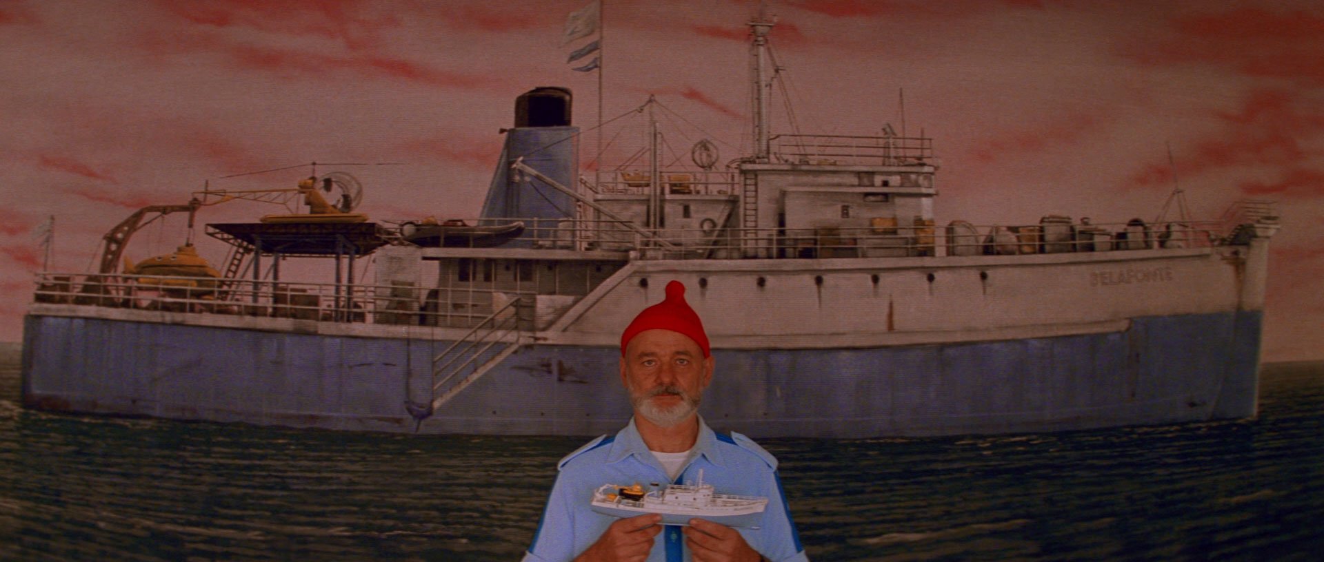 Description: A man in a red hat holding a piece of paper in front of a painting of a boat on the water.