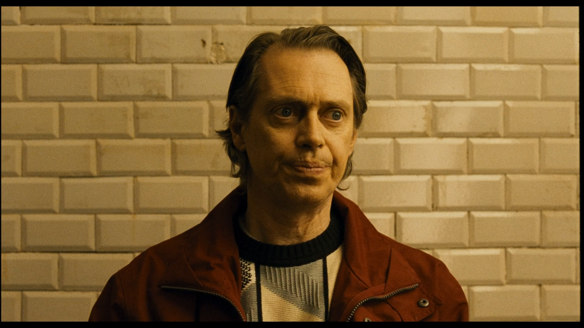 Description: A man in a red jacket standing in front of a brick wall with a white brick wall behind him.