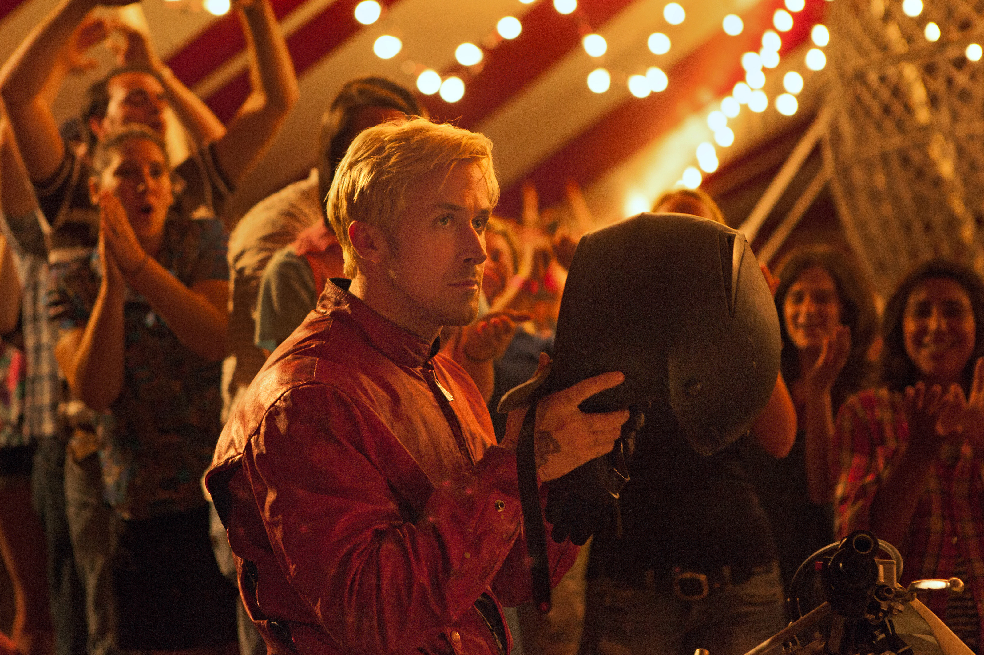 Description: A man in a red jacket holding a black hat in front of a crowd of people in a tent.