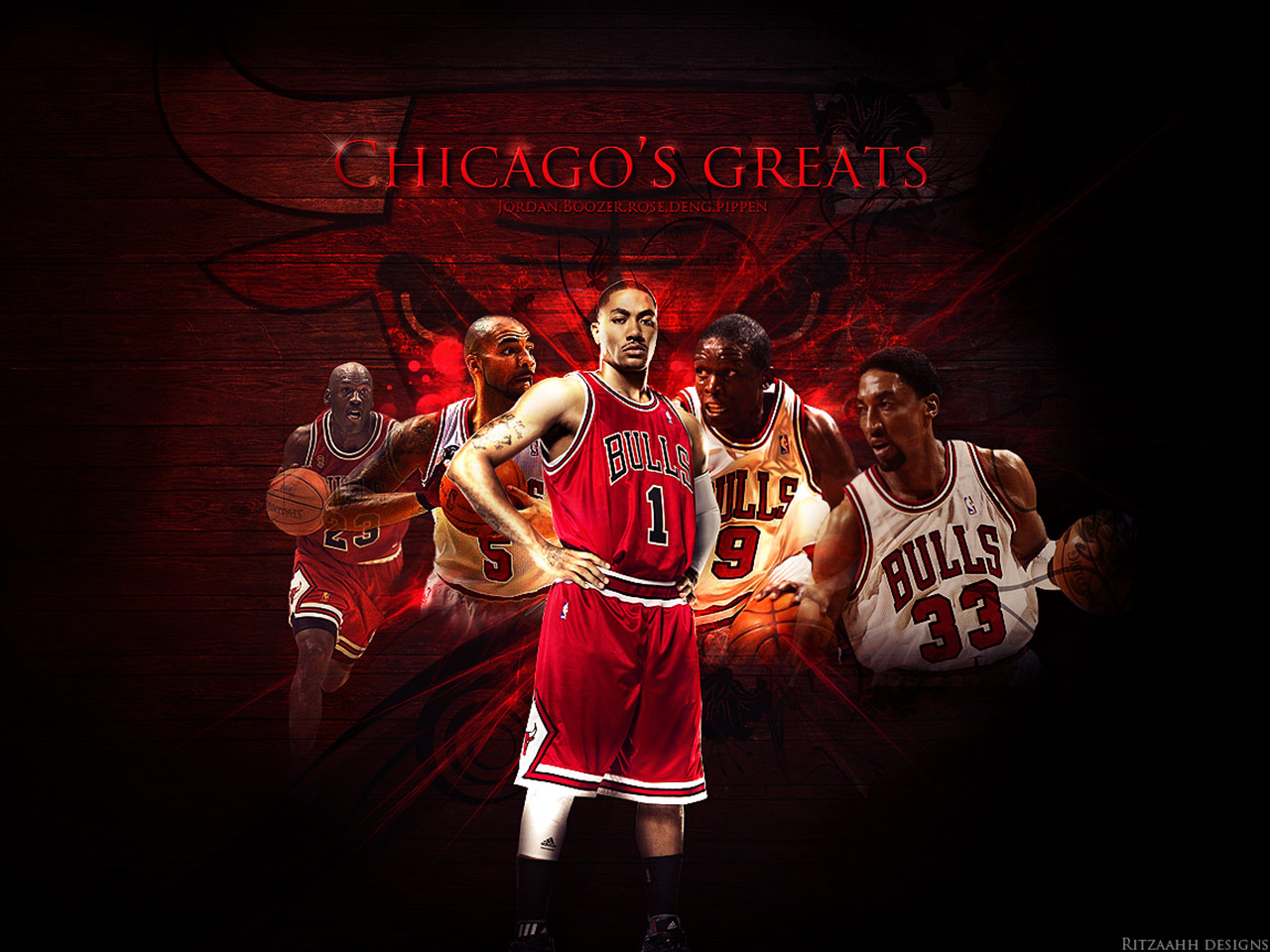 Description: A man in a red jersey standing in front of a group of other men in basketball uniforms and the chicago bulls.