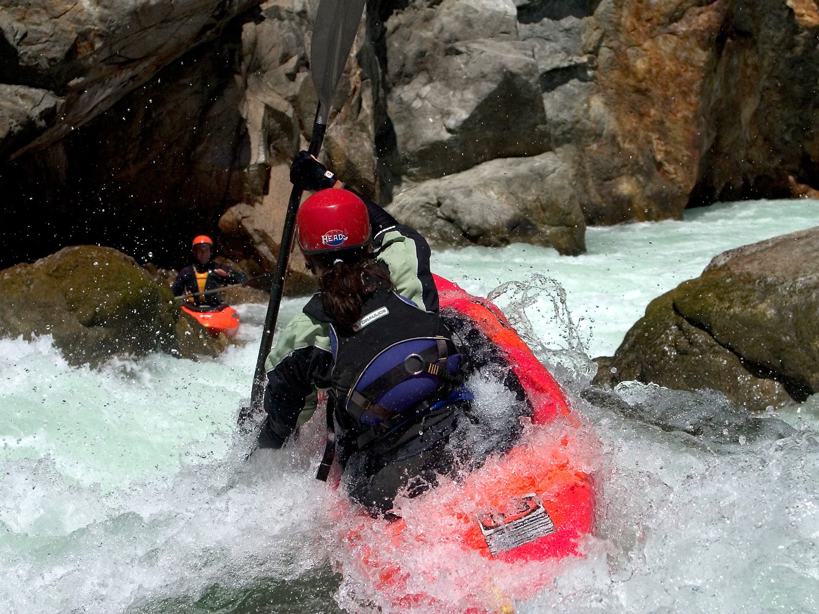Description: A man in a red kayak in a river with rocks and water behind him and a man in a red helmet.