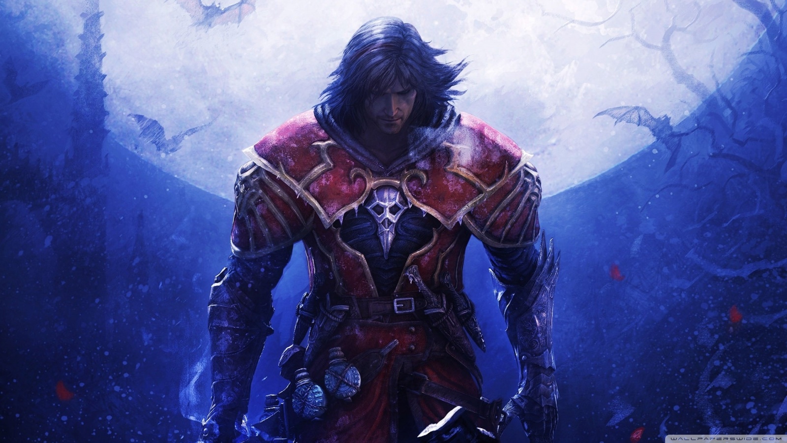 Description: A man in a red outfit standing in front of a full moon with a sword in his hand and a skull in his hand.