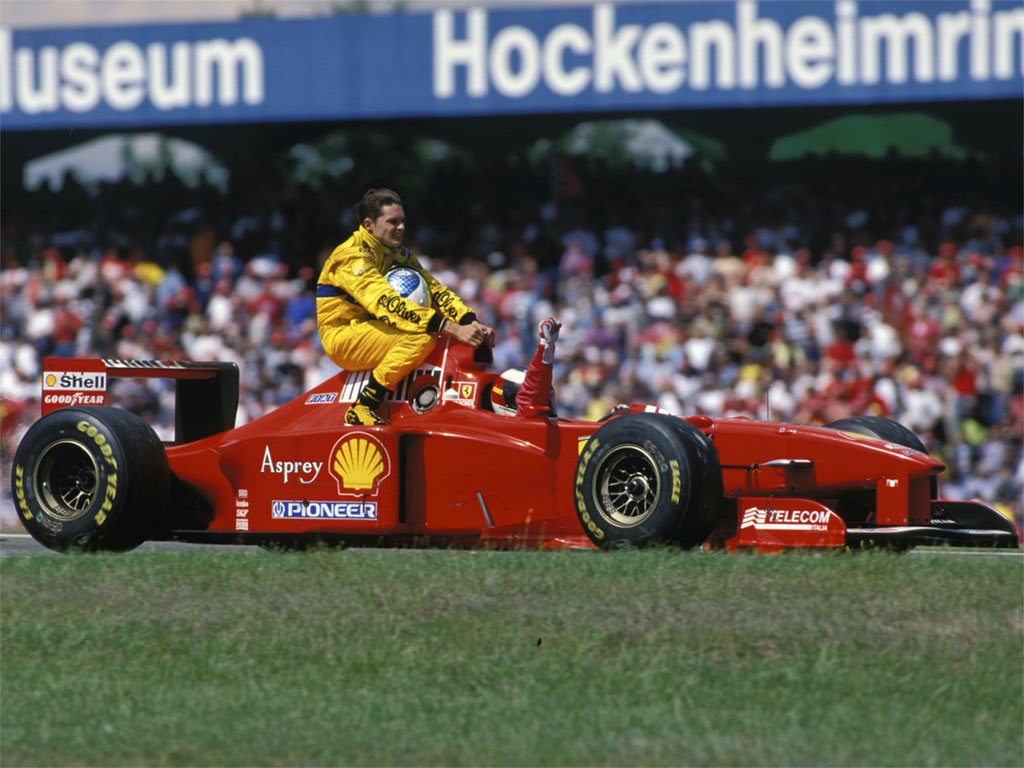 Description: A man sitting on top of a red race car on a field of grass with a crowd in the background.