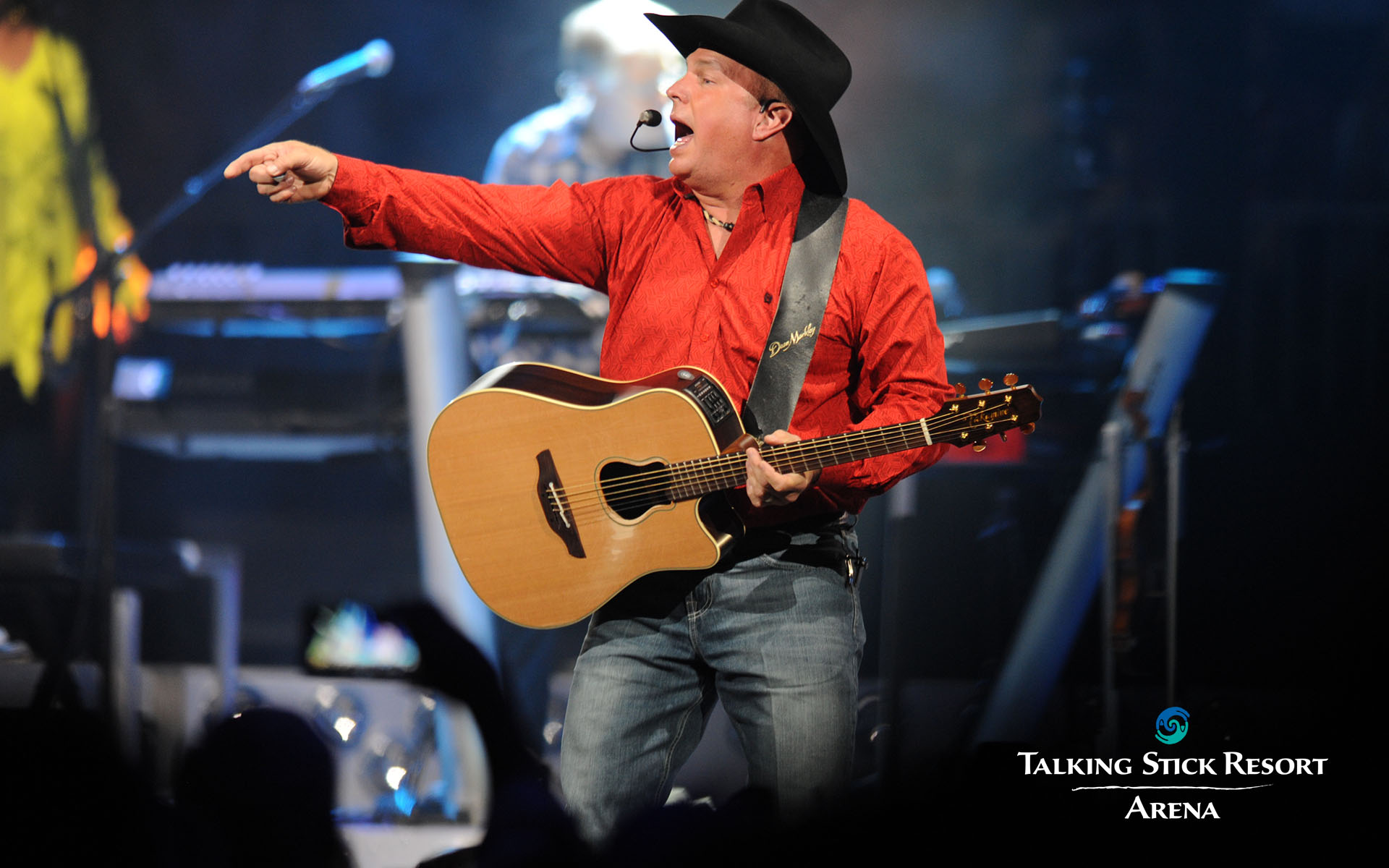 Description: A man in a red shirt and hat holding a guitar and pointing to something on a stage with a microphone.