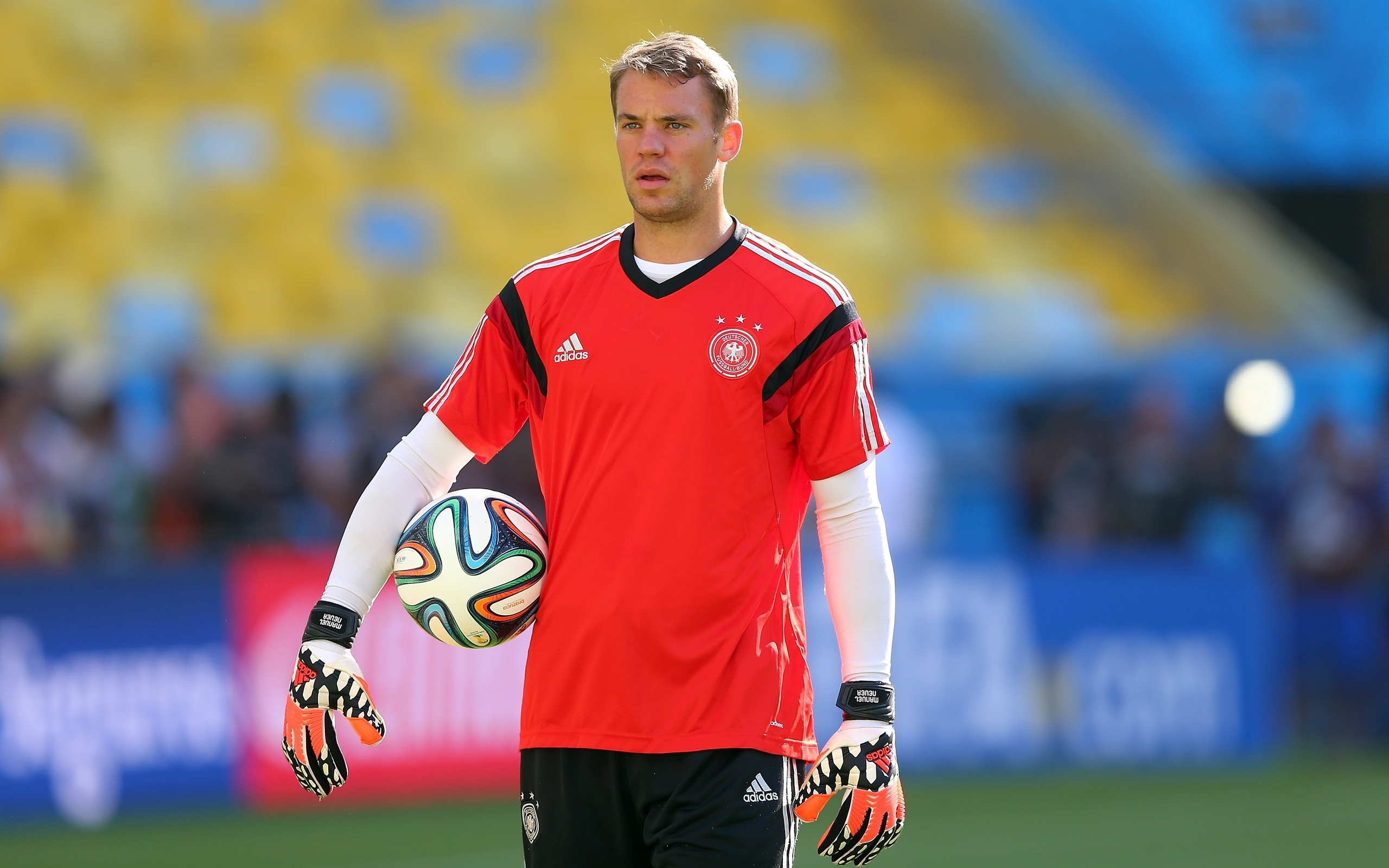 Description: A man in a red shirt holding a soccer ball on a field with a crowd watching him from the stands.