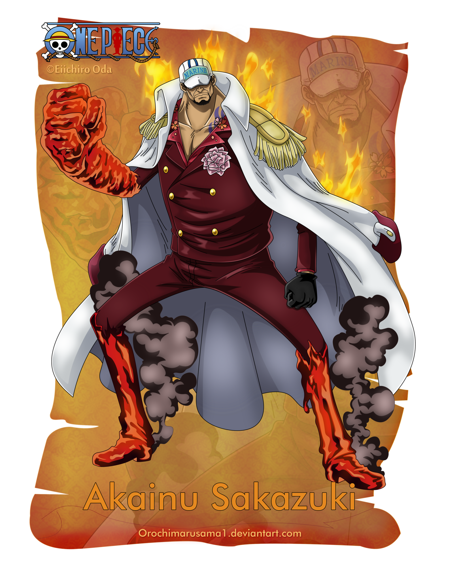 Description: A man in a red suit and white coat with a red and yellow flame on his leg and a white and red coat on his head.