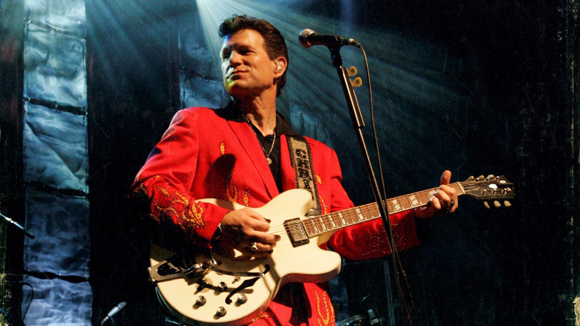Description: A man in a red suit playing a guitar on stage with a microphone in the background and a microphone in the foreground.