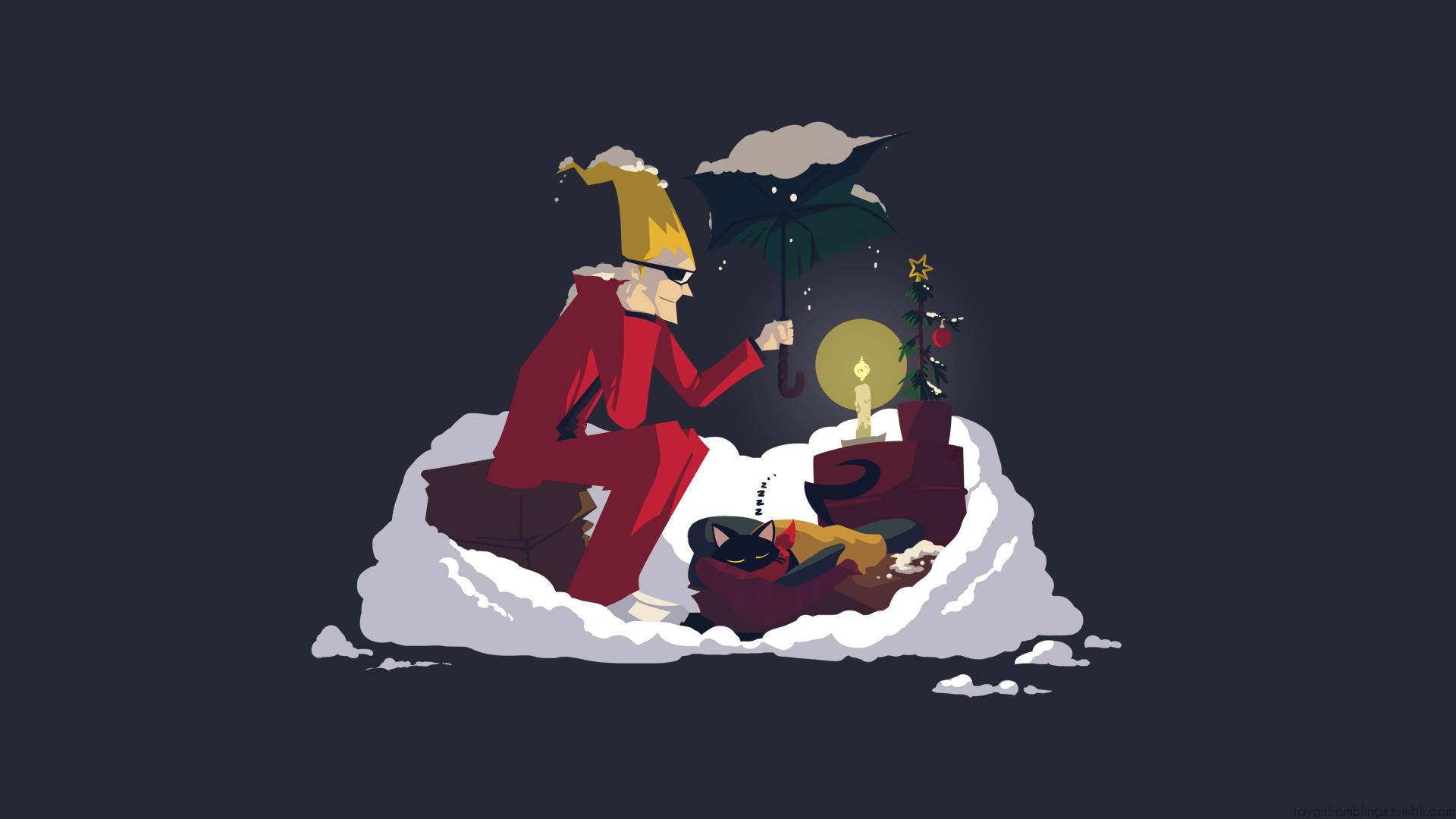 Description: A man in a red suit sitting on a pile of presents with a candle in his hand and a christmas tree in the background.