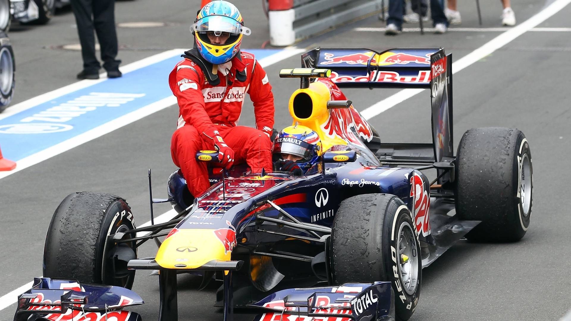 Description: A man in a red suit is sitting on a race car with a helmet on and a helmet on.