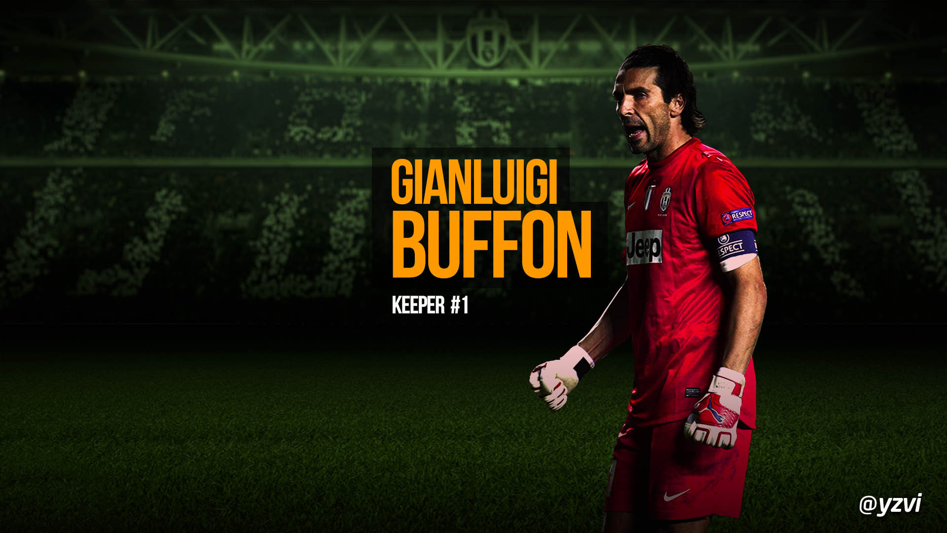 Description: A man in a red uniform standing in a field of grass with a soccer ball in his hand and the words gialili buffon on the side.