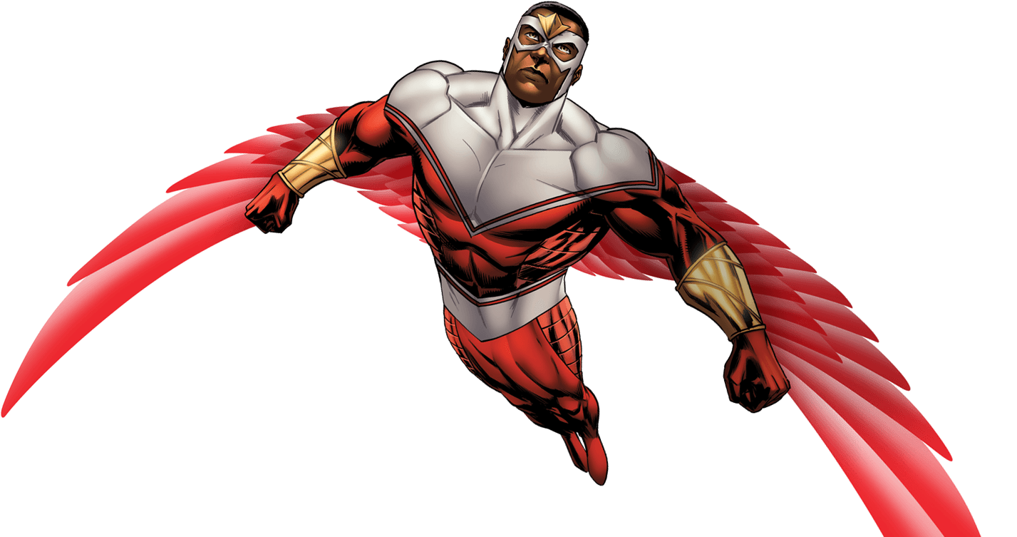Description: A man in a red and white costume with a red cape flying through the air with his arms outstretched.