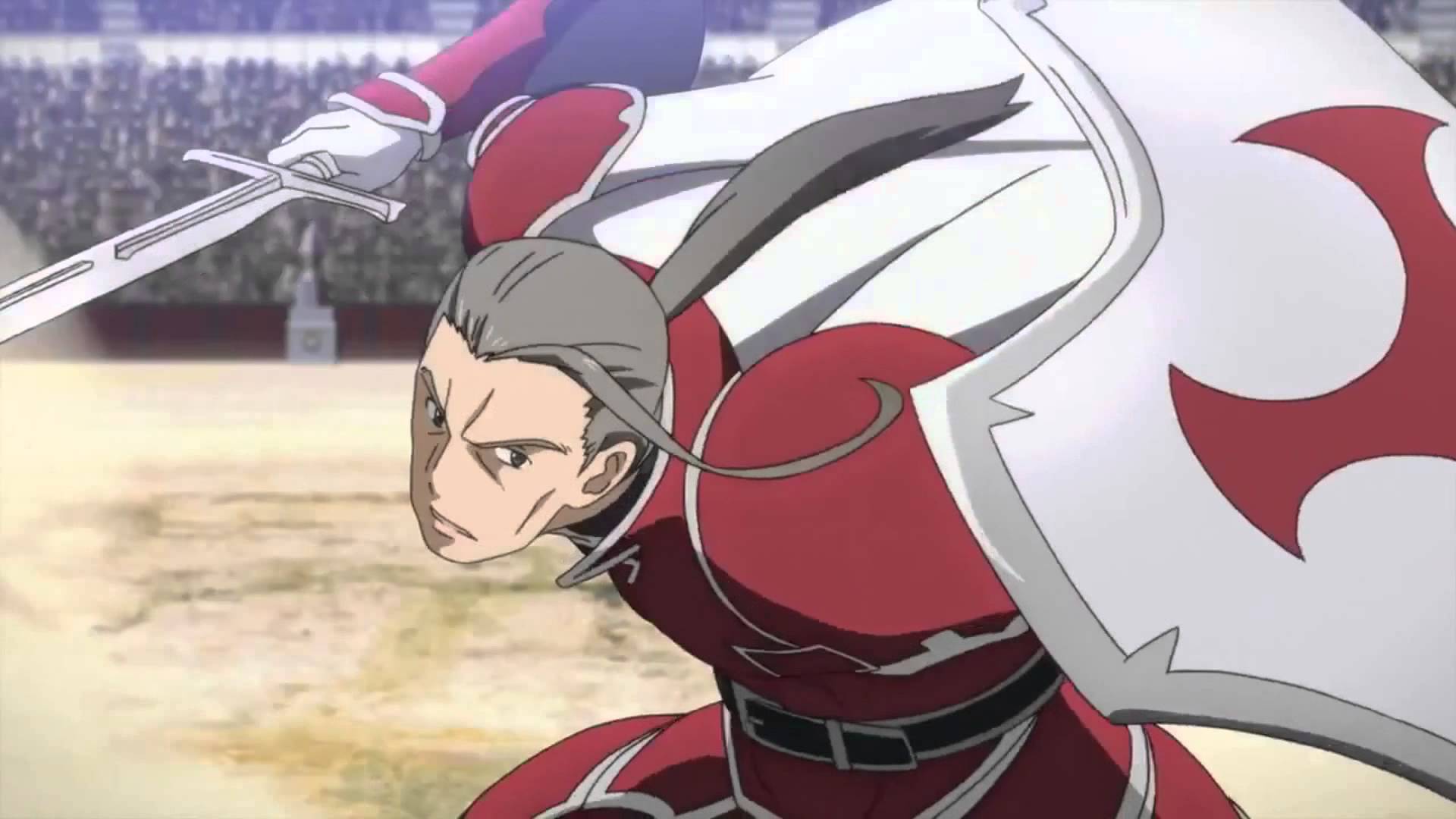 Description: A man in a red and white outfit holding a sword and shield in front of a crowd of people.